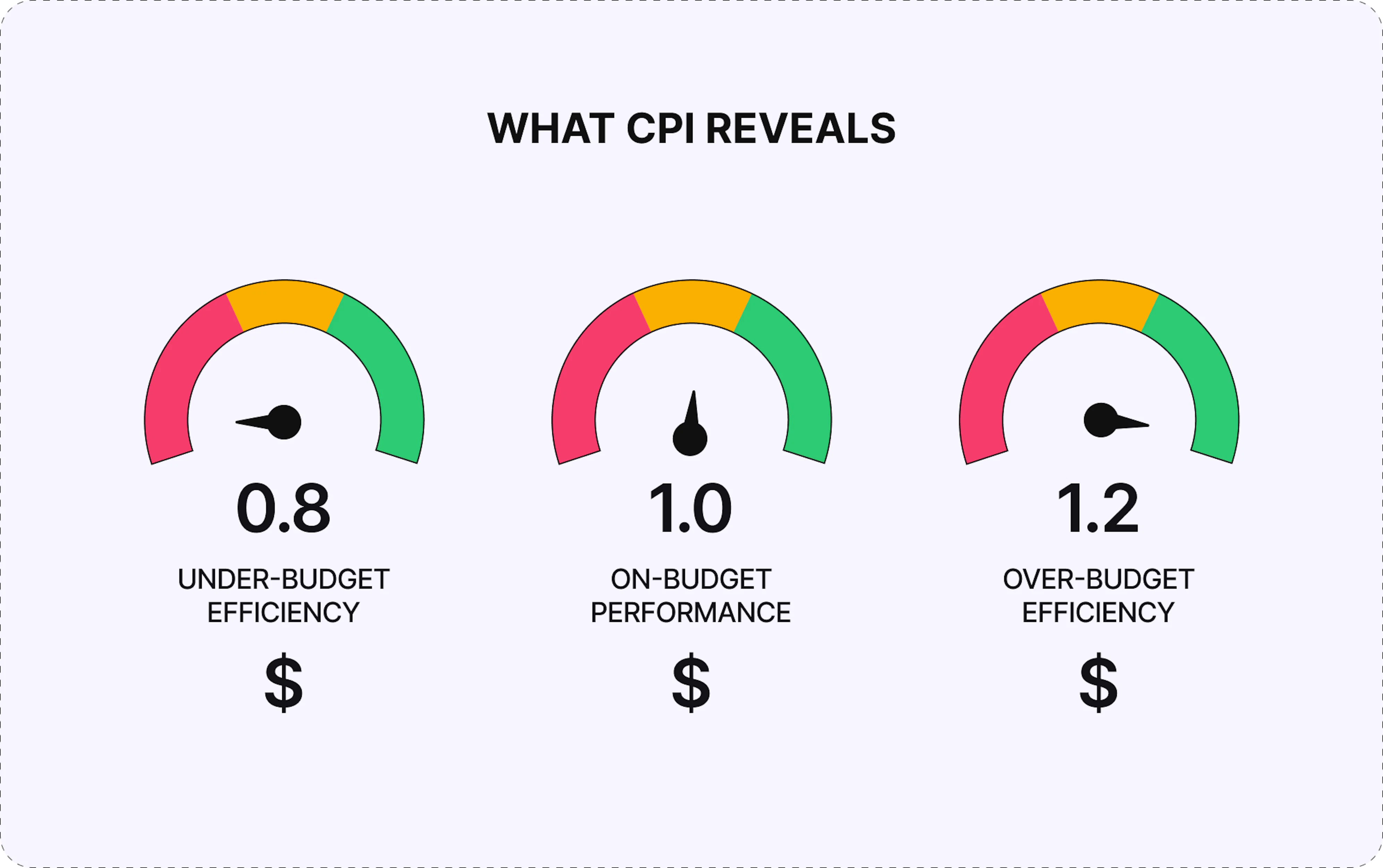 CPI compares earned value (budgeted cost of completed work) against actual costs. If a project completes $100,000 of planned work but spends $120,000, CPI reveals the 17% efficiency loss that raw budget tracking obscures. - Project health beyond the timeline