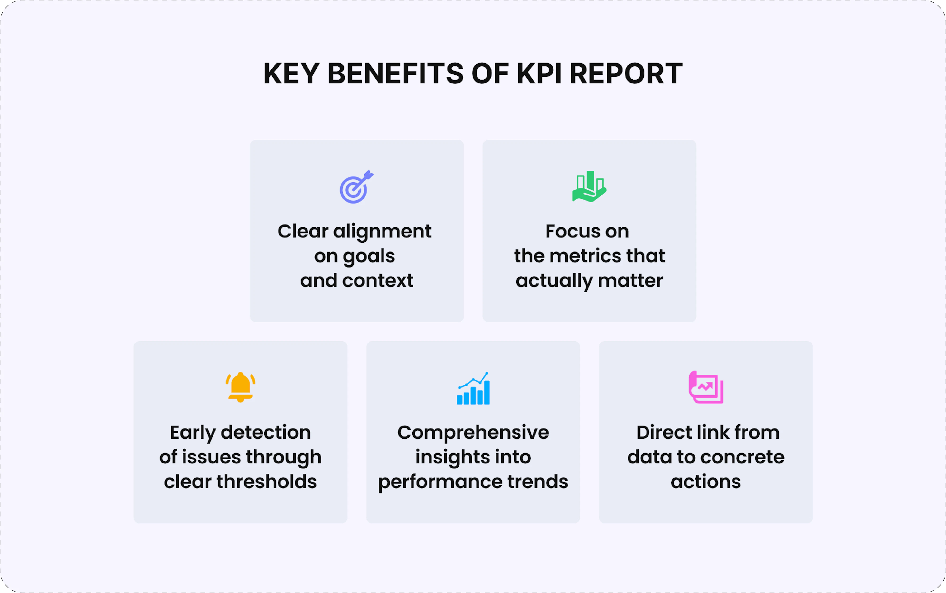 By forcing deliberate selection of a small KPI set, reports direct attention to indicators most closely tied to success across delivery, quality, productivity, and cost, preventing teams from drowning in disconnected data. - Early detection through clear thresholds