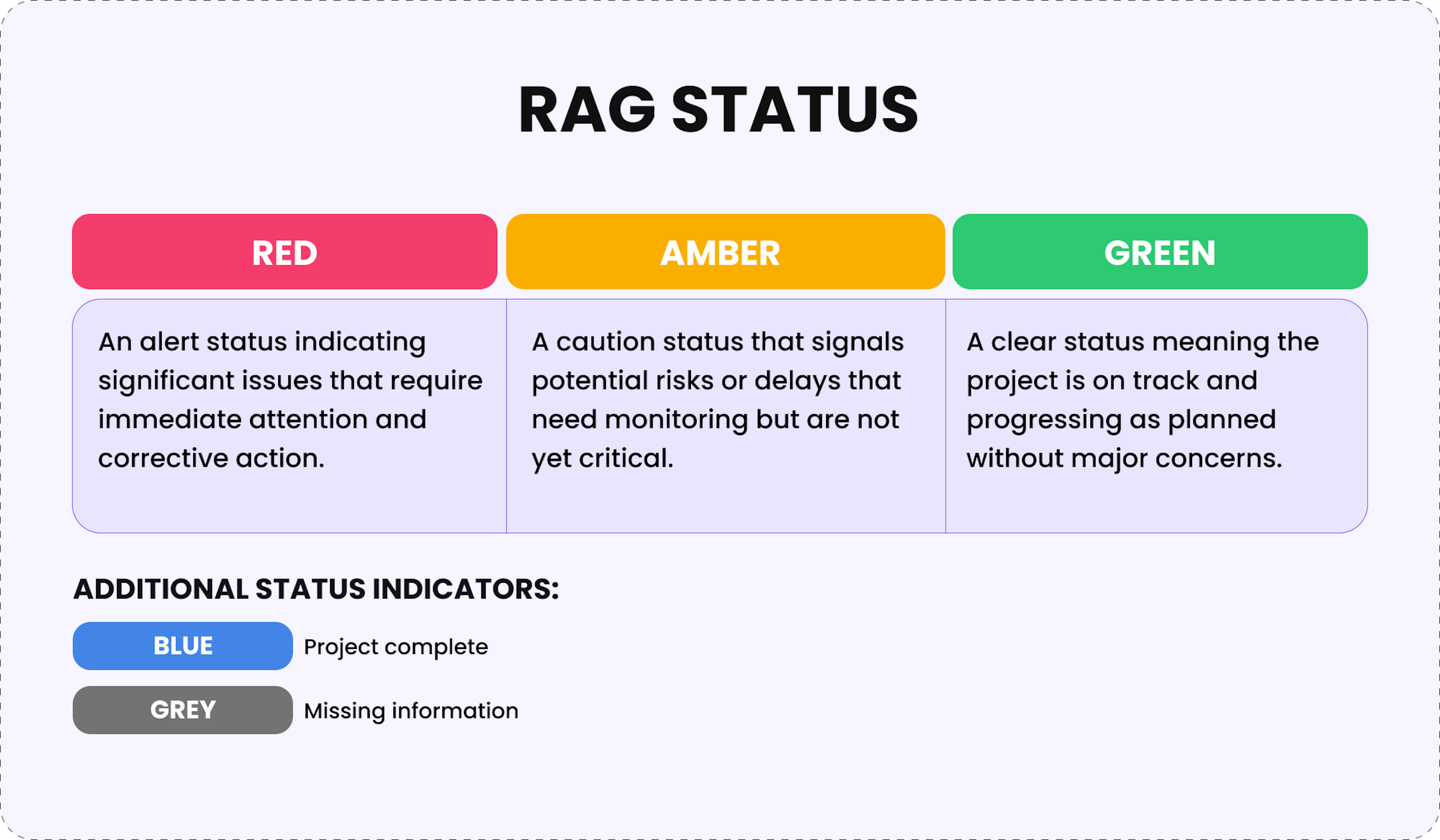RAG status is a project management tool where Red, Amber, Green statuses act as a traffic light system to visually indicate a project's health or progress. Red is an alert for significant issues requiring immediate attention, Amber (or yellow) signals caution for potential risks or delays, and Green means you're in the clear and the project is on track. Additional status indicators may include Blue (project complete) and Grey (missing information) to provide comprehensive project visibility.