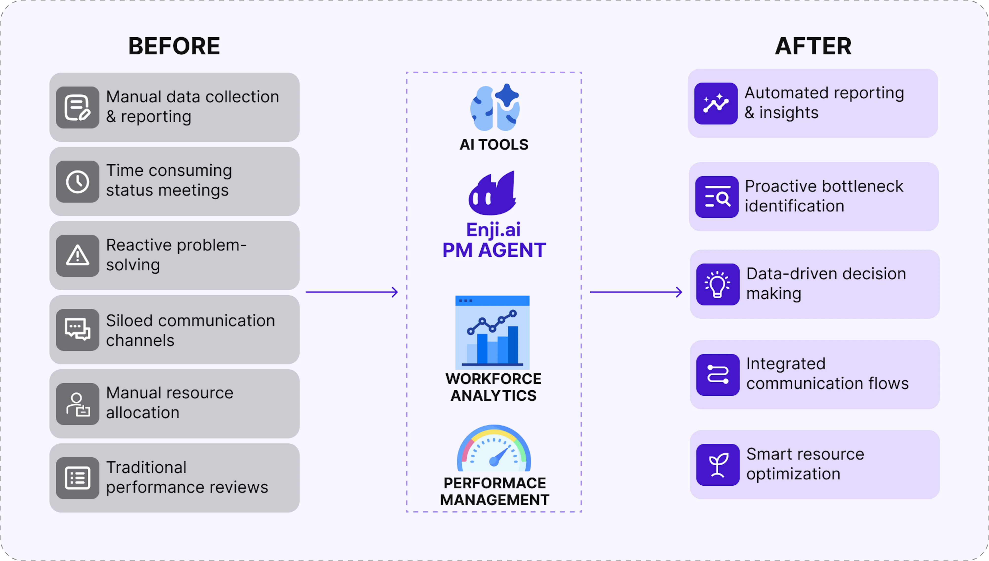 Enji's PM Agent automates routine PM tasks, delivers real-time team insights, and generates custom reports. Managers can instantly identify bottlenecks, optimize workflows, and make data-driven decisions, reducing manual work by up to 90% and unlocking new strategies for performance improvement.