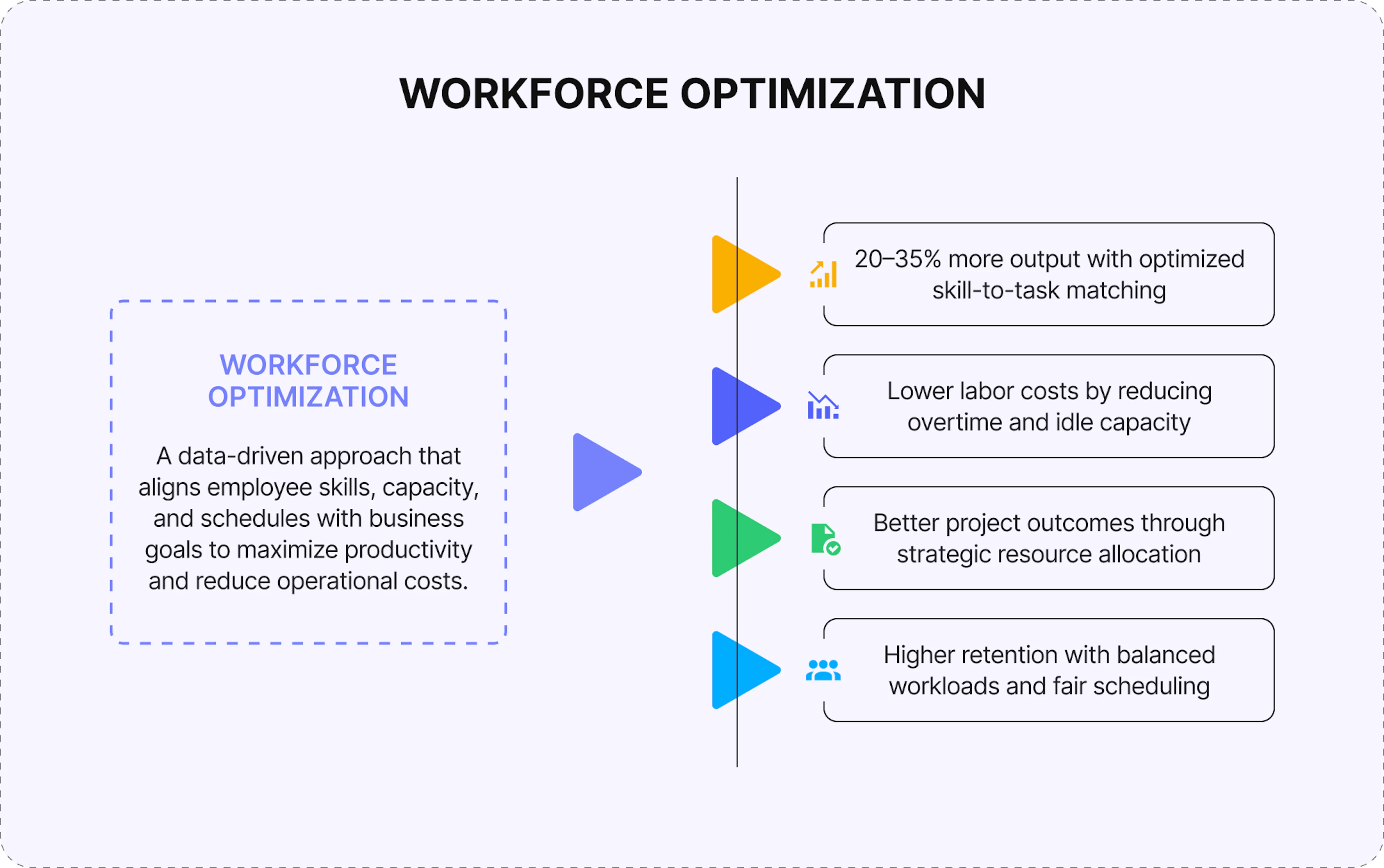 Workforce optimization strategically matches employee skills and availability to project needs, maximizing productivity while maintaining team satisfaction. At its core, it means ensuring the right people with the right skills work on the right tasks at the right time, while balancing costs, meeting deadlines, and sustaining healthy workloads.