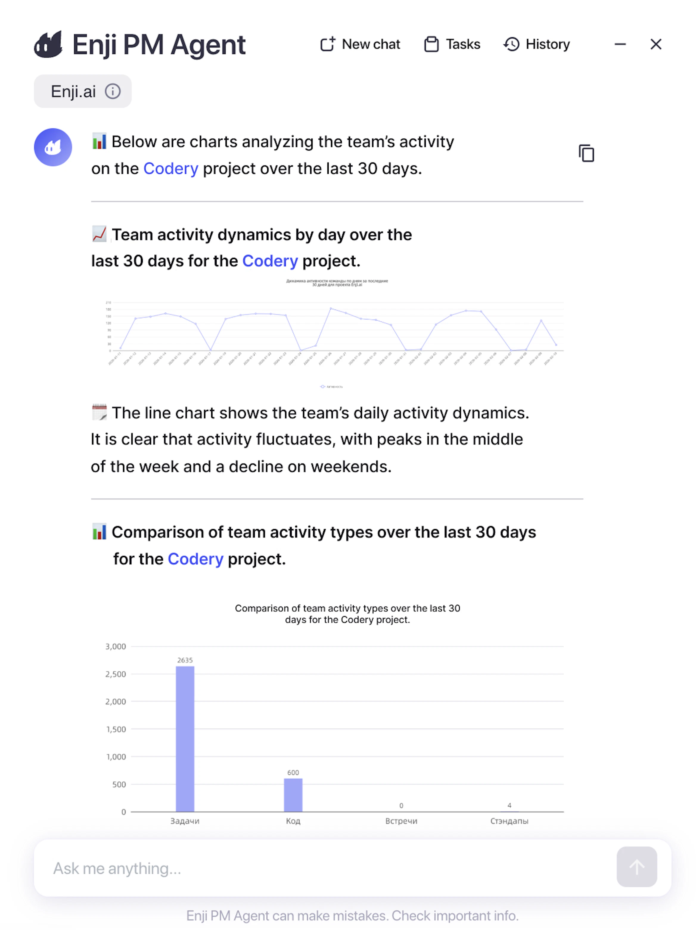 We've implemented data visualization through charts in PM Agent and email reports. The chat uses charts based on chart.js with Enji's color palette and responsive design. For email reports, charts are generated as static PNG images in base64. Users now have a powerful visual analytics tool where PM Agent generates charts for time distribution, productivity dynamics, and team comparisons directly in chat or email reports. Visualization of complex data simplifies anomaly and pattern detection, enabling managers to make data-driven decisions more quickly.