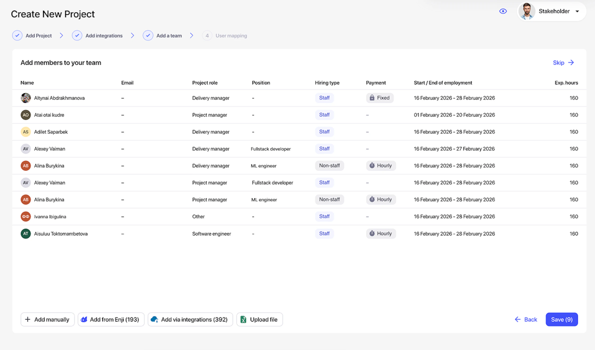 Step 4 – Team addition: Four ways to add employees, from existing Enji users, through users found in integrations, by manual entry, or through Excel upload using a template.