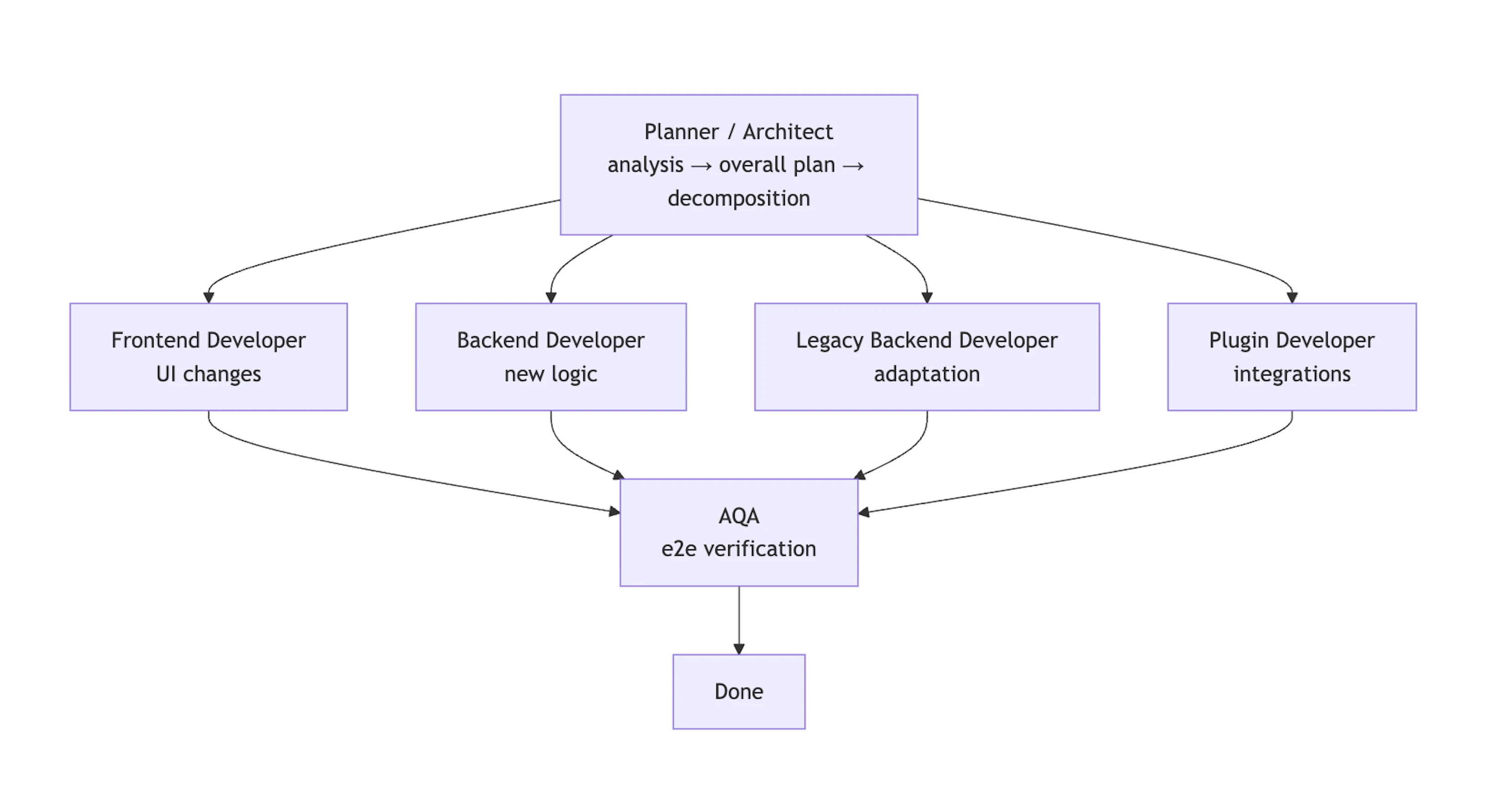 As use cases grew, a single "universal" agent became unmanageable. It was simultaneously trying to plan, make architectural decisions, write code across different domains, and verify results. We'd hit the classic "god object" problem, just in AI agent form.