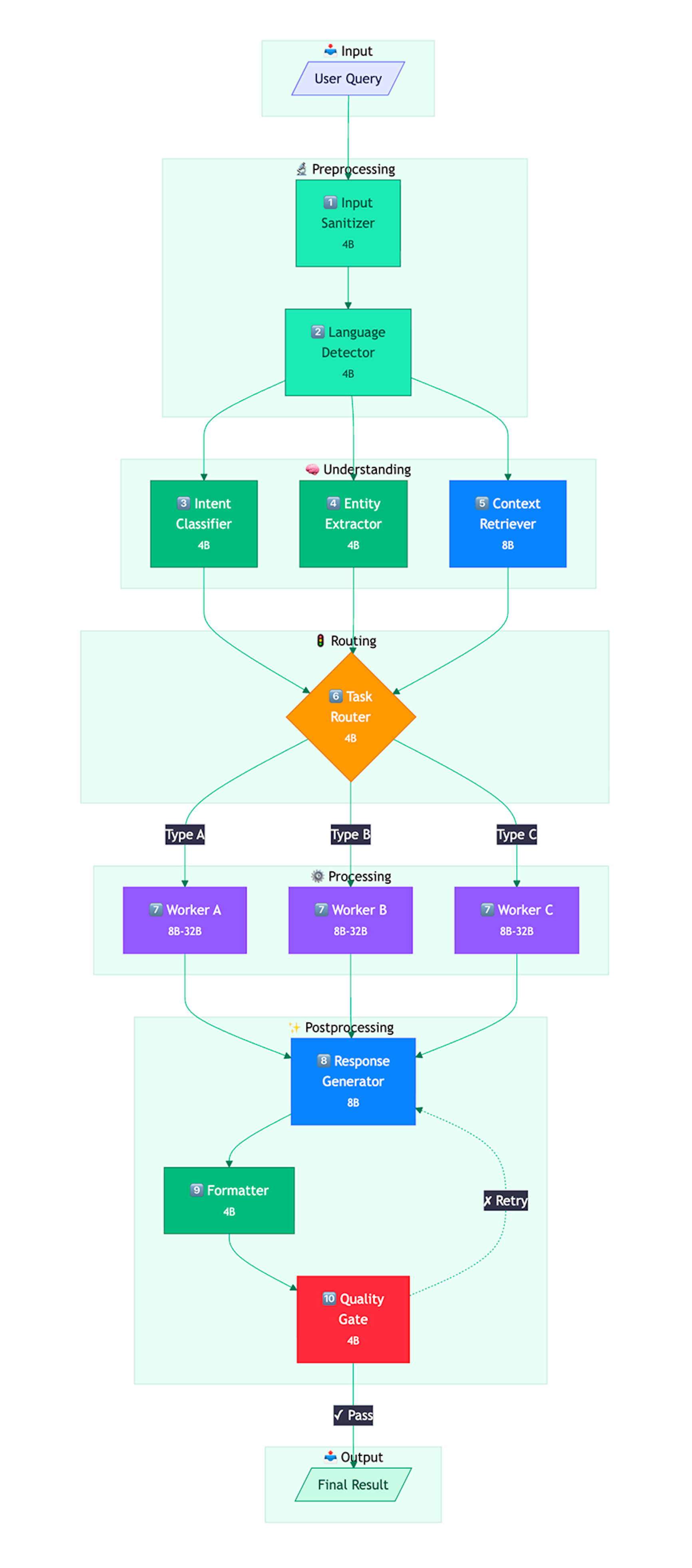 So we must look at smaller models. Through extensive trial and error, our team settled on Qwen3 and its three versions: 4b, 8b, and 32b (the 32b version even has reasoning capabilities for complex tasks). For different tasks, we call different Qwen3 models varying by parameter count. If we determine the current node (I'll explain nodes below) doesn't need 32b parameters and can handle its job with 4B, we call the smaller model for hardware savings, burning less electricity, using fewer resources, and enabling parallel computing.